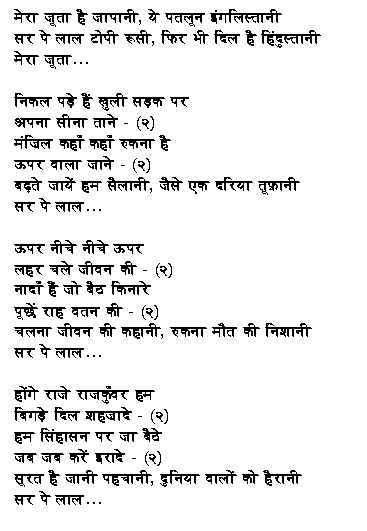 The song is "Mera joota hai japaani" from the 1955 film Shree 420 (Mr. 420), directed by Raj Kapoor, music by Shankar Jaikishen, lyrics by Shailendra and Hasrat Jaipuri: