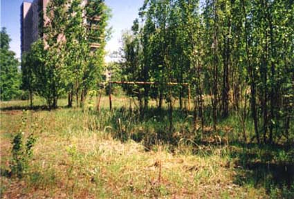 The school's soccer field is overgrown with trees instead of grass.