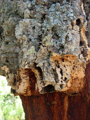 The cork on the lower parts of the trunks had been harvested. We later drove by what looked like a huge lumber yard full of stacked sheets of peeled-off cork bark.