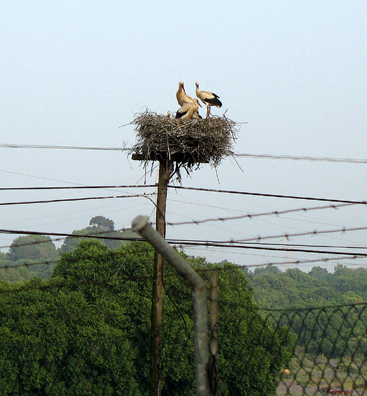 Families of storks raise their young atop electrical towers lining the railroad tracks near San Roque.