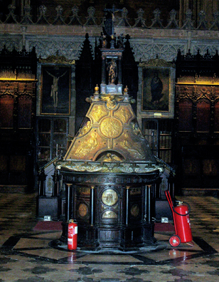 Left: the majestic organ in the choir; right: a music stand surrounded for some reason by fire extinguishers.