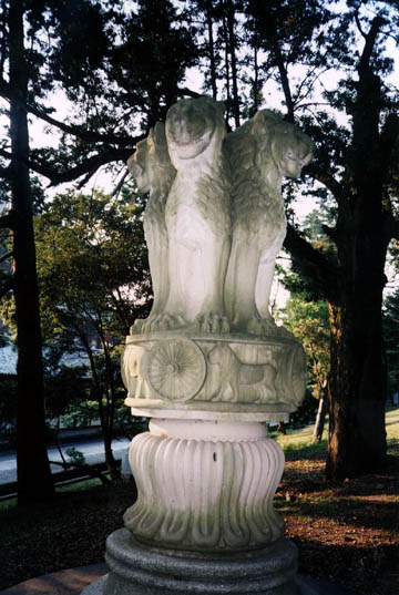 Also in Nara we encountered this modern replica of the capital from a pillar erected by the great Buddhist ruler of India, Ashoka, placed here by an international Buddhist organization working for peace. The original was found at Sarnath, near Varanasi, where the Buddha preached his first sermon and where for many centuries a large monastery flourished. This was a reminder of the powerful reach of Buddhism across Asia, even though there are few Buddhists today in the land of its origin. [Next] [Intro] |