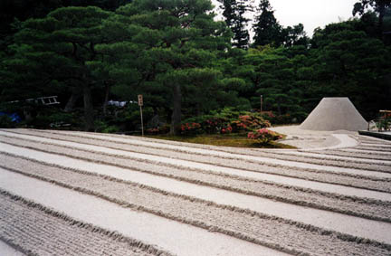 It features several interesting "stone gardens" (actually mostly composed of sand or fine gravel) In the foreground this artfully raked bed of sand designed in the early Edo period (17th C.), is called "Ginshaden" ("sea of silver sand") and is meant to represent a famous Chinese lake, with ripples striped by moonlight..