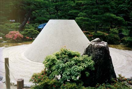 Adjacent to it is a "mountain" of carefully piled sand said to represent Mt. Fuji. Obviously such meticulously composed works must be tended as intensively as any living garden, being raked and smoothed constantly. The Japanese tendency to maintain traditions of constantly rebuilding ancient constructions is perfectly illustrated here.