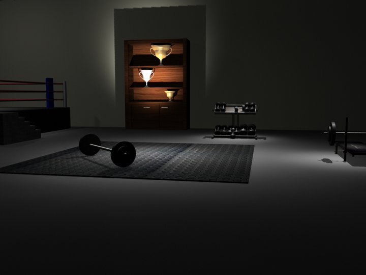 This scene is of a static environment. All shadows and the overall dark atmosphere of the area were created with lights such as the spot and area lights. The environment is a boxing arena/workout gym. The models in this image were all created using polygons. The textures of the items such as the mat, trophy case and dumbells were created using bumpmaps and imported/created textures.