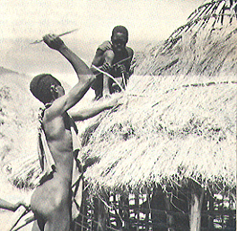 Kauar and Lojieri help thatch the roof. Kauar, exceptional in that he took such enormous pleasure in being alive, died a month or two later, of exhaustion.