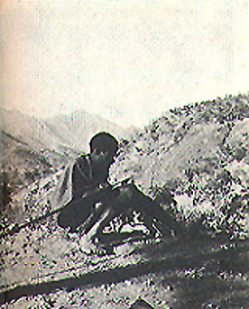 A lone Ik hunter, poaching in the Sudan, sharpens his spear. Whatever he finds he will try to keep for himself; for he knows that his wife and family will do the same.