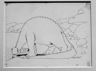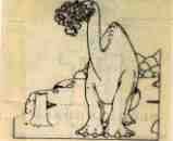 Commentary: It is worth noting that despite filmdom's inclinations as regards dino-pix, these early pieces offer us a personable and relatively mild dinosaur with a "pet" name. Leonard Maltin asserts that "McCay's efforts during the first ten years of this century are widely considered to be the pinnacle of American comic art. McCay combined the abilities of a superb draftsman with the imagination of a master storyteller." Both Gertie films involve performance in front of an adoring crowd, and one wonders about the nostalgic tone in the fragment of the sequel: an autobiographical impulse on McCay's part?