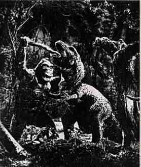 A tyrannosaur attack on Ann brings Kong to the rescue. A dizzying bit of film shows the log falling with Ann atop. The fight is won by Kong tearing apart the dinosaur's mouth. He checks for signs of life and beats his chest. Then, Kong looks at Ann [a filmic zoom].