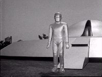 Everyone is so (paranoid) "jittery," says Helen. When Mom tells Bobby to see less of Mr. C. and goes out with her steady date Tom, an insurance salesman and big bastard to her and Mr. Carpenter, Klaatu borrows a flashlight from Bobby, who then tails Mr. Carpenter to the spaceship, where he activates the robot, Gort, who conks the two guards while Klaatu enters the saucer where hand-swoop-activated devices control everything.