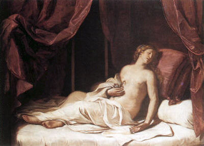 "Cleopatra sees death not (like Hamlet) as a sinking into silence or (like Macbeth) the end of a meaningless tale, but as the ultimate consummation of her relationship with Antony" (Wells 311) -- a liebestod. "The stroke of death is as a lover's pinch, / Which hurts, and is desir'd" (V.ii.295-296). Iras inexplicably falls dead, and in an apotheosis of insane jealousy, Cleopatra wants to hurry her own death so that Antony doesn't have a chance to kiss Iras on the other side. Cleopatra holds an asp to her breast and another to her arm, and dies.