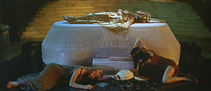 As the guards enter, Charmian also applies an asp and dies. Dolabella tells Caesar, "O, sir, you are too sure an augurer; / That you did fear is done" (V.ii.334-335) -- simultaneously a bit of flattery and a jab. Caesar asks a bit about the deaths and concludes that they poisoned themselves with the figs. A guard draws his attention to other evidence and Caesar changes his informal coroner's report to death by asp. For the first time he seems impressed with Cleopatra's integrity. He instructs that she be "buried by her Antony" (V.ii.358).