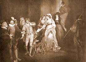 The play is often compared to a fairy tale, and with good reason. It follows the general pattern of what is sometimes called the "Loathly Lady" story, familiar from Chaucer's "Wife of Bath's Tale." A woman despised by a haughty knight (in Chaucer, because she is old and ugly; in All's Well, because she is not a nobleman's daughter) knows the answer to a crucial, lifesaving question. Once she has provided the answer, she gets to choose her husband. (Garber 622)Relishing this meat market scene, or sixteenth-century episode of The Bachelorette, Helena playfully approaches several of the men but lights on Bertram: "I dare not say I take you, but I give / Me and my service, ever whilst I live, / Into your guiding power. -- This is the man" (II.iii.102-104). Despite the ostensible humility here, Bertram is naturally outraged, but also comes across as a nasty snob: "A poor physician's daughter my wife! Disdain / Rather corrupt me ever!" (II.iii.115-116). The King acknowledges that his honor is at stake and cannot seem to understand that since the lady is virtuous and since he will "build up" her status (II.iii.118), how could Bertram not comply? The King accuses the ingrate Bertram of "vile misprision" (II.iii.152). Probably dripping with sarcasm, Bertram has no choice but to obey the command.