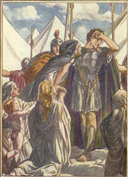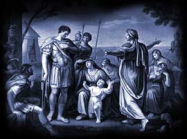 "Too late she tries to teach him that life is not a matter of blows and rages alone; that there are softer and nobler virtues" (Asimov 249). Volumnia, after much speechifying, has Virgilia present his son to him. Virgilia notes that the boy will "keep your name / Living to time" (V.iii.126-127). The kid is a chip off the old block, declaring that his own father "shall not tread on me; / I'll run away till I am bigger, but then I'll fight" (V.iii.127-128) -- something Coriolanus has recently done. He may have mixed emotions about such a proclamation -- it's difficult to say, although he does act literally moved in that he awkwardly justifies simply standing up at this point. Volumnia, at great length, says that he will be considered a traitor if he persists, whereas peace benefits all. She goes into the unappreciated-sacrifices-of-a-mother routine and accuses him of excessive pride. She uses "only kinship terms and not names" (Garber 798): son (V.iii.148), daughter (V.iii.155), boy (V.iii.156). All kneel, at Volumnia's command, and eventually, somehow, Coriolanus gives in to their pleading. Although most think that Volumnia is ultimately responsible for Coriolanus' change of heart, Shakespeare "is not in the habit of giving the deciding voice to the utterer of the longest speech" (Goddard, II 219), and so a few critics suggest other possibilities; in any case, though no guarantee Shakespeare intended this to be the answer, Coriolanus himself seems to think it was Volumnia primarily in his histrionic but emotionally charged lament: O mother, mother! |