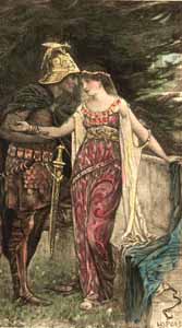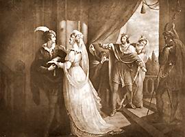 The Queen enters with Imogen and Posthumus, insisting that she is not a stereotypical evil stepmother to Imogen and that she will serve as an advocate for Posthumus with the king. Cymbeline has forbidden the newlyweds to speak together, but the Queen gives them some time and exits. "Does not the parabolic quality of all this fairly shout aloud and demand that we think of Imogen as the True England wedded secretly to the poor but genuinely gentle Posthumus Leonatus, English Manhood and Valor?" (Goddard, II 256).