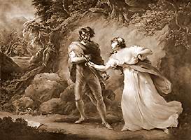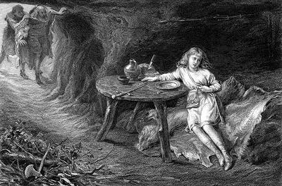 In Wales (and coincidentally near Milford-Haven), Belarius, who was banished from the British court years ago and adopted the name Morgan, lives with his two foster sons, Polydor and Cadwal, who are really Guiderius and Arviragus -- the long lost sons of Cymbeline -- and don't know it; "the two boys are temperamental and emblematic opposites: Guiderius exemplifies the active ideal, and Arviragus the contemplative" (Garber 811). As indicated (III.iii.35f) the depiction of the "younger brother Cadwal is more poignant as he de-idealizes the hunter's life" (Bloom 625). Belarius praises the simple country life as opposed to the backstabbing world of the court, and the sons complain that they have no means of comparison. But Belarius mentions that he because of treachery he was stripped of his lands and title. Belarius seems to be another depiction of the banished Oxford (esp. III.iii.55-69) (Ogburn and Ogburn 295, 962), added to the plot, along with the storm and the robbery in the 1580s (Ogburn and Ogburn 327). If Belarius and the boys are part of a later revision, the boys were originally gotten out of the way for the sake of focus (Ogburn and Ogburn 155). Regarding one flashback (III.iii.29f), "The image of the confined debtor is a dark one for a king's son, and has the poignance here of a changeling's fantasy that is no fantasy" (Bloom 624). Belarius privately reveals that he stole Cymbeline's sons in vengeance, came to love them, and married their nurse Euriphile to create for them the illusion of a birth family. The boys are displaying their princely qualities these days, and daily honor the grave of their foster-mother Euriphile.