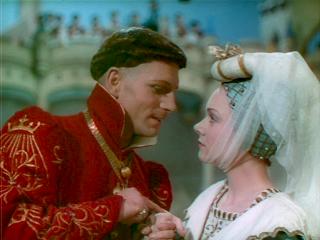 Henry's "wooing" of Katherine -- or as he calls her, Kate -- comes off superficially as the charming comical awkwardness of a soldier wooing an aristocratic lady. But Katherine knows that "the tongues of men are full of deceits" (V.ii.117-118), and for all his insistences on lacking eloquence he certainly does go on for a long time speechifying at her. Katherine asks, "Is it possible dat I sould love de ennemie of France?" (V.ii.169-170). To Henry, and probably most others, the match with Katherine is a marriage of nations, not of humans. So Henry can answer that he is not the enemy of France -- quite the opposite. That this marriage is about rapacity for land rather than love is clear from Henry's rhapsodizing about France itself (V.ii.172-176). At best, after some banter about the language barrier, "I love thee cruelly" (V.ii.202-203), "he protests, letting slip a Janus-faced adjective" (Goddard, I 264). He thinks calling her "a good soldier-breeder" (V.ii.206) is an appeal to maternal instincts. (And besides, it'll be Henry VI they produce, not the world conqueror Henry envisions here.) After substantially more dissertation from Henry, Katherine punctures the hypocrisy of all this -- the pretense that any fate is in her hands -- by noting that the match is entirely up to her father (V.ii.247). Although the Princess and Alice insist it is not French custom for ladies to kiss before marriage, Henry forces his mouth on hers.