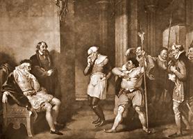 Shakespeare seems to have coined the word "sanctimonious" (I.ii.8) (Farina 38) -- a great word. Despite the first few lines here, there will be no further mention of threats of war, the King of Hungary, or the "other dukes" (I.ii.1f) (Asimov 637). If the play was written in the early 1580s, the war may be the papal invasion of Ireland, the sweat is the plague raging in London especially in 1582, and the mention of gallows refers to the executions of some Catholic priests and Campion (Clark 451-452; Ogburn and Ogburn 339). Lucio and two gentlemen slum it, speaking in Elizabethan vulgar prose slang and joking about venereal disease. Mistress Overdone, the local whorehouse's madam, brings news of their friend Claudio being arrested and sentenced to execution for knocking up the young Juliet. A "wave of puritanism is sweeping over Vienna" (Asimov 638), and the new administration is tearing down whorehouses and enforcing sexual morality laws ignored for almost two decades. Also, in 1580, London authorities received permission from Elizabeth and the Privy Council to exile the players and pull down the playhouses and dancing-houses (Clark 452). But Escalus to Pompey (II.i.243f) may resemble Burghley vs. theater; in the play he'll profit from the confiscated land (Ogburn and Ogburn 338). The three men leave to find out more about Claudio.