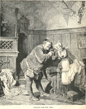 The more disturbing problem is that we have what Harold Bloom calls a "pseudo-Falstaff," "a nameless imposter masquerading as the great Sir John Falstaff" (Bloom 315; cf. Goddard, I 175, Ogburn and Ogburn 738), operating out of necessity and survival instead of being the force of anarchy and fun. And "from early in the nineteenth century the idea of a single Falstaff character drawn, sometimes romaniticized, from the history plays has been used as a yardstick with which to beat the Falstaff of The Merry Wives of Windsor" (Wells 187). "Glutton, drunkard, coward, liar, lecher, boaster, cheat, thief, rogue, ruffian, villain are a few of the terms that have been used to describe a man whom others find the very incarnation of charm, one of the great liberators of the human spirit, the greatest comic figure in the history of literature" (Goddard, I 175). At his best in the Henry IV plays, Falstaff is "Imagination conquering matter, spirit subduing flesh" (Goddard, I 178). But here there's no cheeky rebellion; instead we have his attempt to win a place within this bourgeois society, which, because it's all about property (possession of women, fear of theft), makes the play somewhat unpopular. It's a "sadomasochistic" (Bloom 317) carnival of "bear-baiting" (Bloom 318) and Falstaff's three humiliations: being dumped in the Thames with laundry, beaten in drag, and tormented into confession. Wit and eloquence have left Falstaff, and he is "baffled, duped, treated like dirty linen, beaten, burnt, pricked, mocked, insulted, and, worst of all, repentent and didactic. It is horrible" (A.C. Bradley, qtd. in Bloom 317; cf. Wells 188).