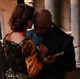 Othello triumphantly enters, having repelled the Turks. He greets Desdemona: "O my fair warrior!" (II.i.182). Celebration is in the air, but Iago privately strikes a note of disharmony: "O, you are well tun'd now! / But I'll set down the pegs that make this music" (II.i.199-200). With everyone else gone, Iago tells Roderigo that Desdemona is attracted to Cassio and will soon tire of her fling with Othello: "her delicate tenderness will find itself abus'd, begin to heave the gorge, disrelish and abhor the Moor; very nature will instruct her in it and compel her to some second choice" (II.i.232-235). Roderigo says the friendliness between Cassio and Desdemona "was but courtesy" (II.i.256), but Iago says, "Lechery ... an index and obscure prologue to the history of lust and foul thoughts" (II.i.257-258). Iago insists that Roderigo must find some way to enrage Cassio -- they can use his provocation to some advantage.