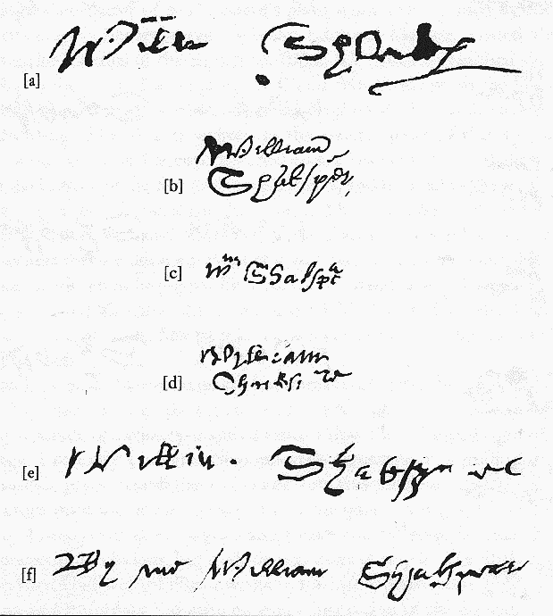 Infirmity doesn't explain the first three even more primitive signatures. This does not strike me as the handwriting of a very literate person. The rest of Shakspere's family seems to have been illiterate, signing their names with an X. And note that none of these signatures is spelled "Shakespeare" nor indicates a long 'a' in pronunciation.