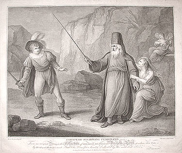 Mysterious songs (sung by the invisible Ariel) lure Ferdinand, son of the King of Naples, to an encounter with Miranda. She hasn't seen many people before and takes him for a divine spirit. "At first sight / They have chang'd eyes" (I.ii.441-442), notes Prospero, and he wants them together but hints that that plan is best served if he plays the archetypal disapproving father, "lest too light winning / Make the prize light" (I.ii.452-453). He accuses Ferdinand of spying until the young man draws his sword. Prospero then demonstrates his powers on Ferdinand, magically keeping him from advancing. Miranda pleads for him, but Prospero says that "To th' most of men this is a Caliban" (I.ii.481). Ferdinand has no problem obeying Prospero, and Miranda assures Ferdinand that Daddy's not so bad really. The opposite of Hamlet in this regard, Ferdinand declares, "space enough / Have I in such a prison" (I.ii.493-494). |