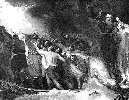 | The setting is an island "somewhere between Italy and the African coast" (Asimov 652), but which may just stand for England according to Anderson's idea of the play being a grotesque satire on the Essex Rebellion (351). Miranda begs her father Prospero to stop the storm if he used his "art" to create it; she's seen people suffering. The name Prospero may come from Prospero Fattinanti, the new duke in Genoa in 1575 during its struggles with Milan (Anderson 92). Prospero assures Miranda there's been "no harm done" (I.ii.15). She doesn't understand enough, so it's time she knew their history on this island, about which Prospero has often begun telling her but has always stopped short. He lays down his mantle, saying, "Lie there, my art" (I.ii.25), presumably referring to his garment but perhaps he's telling Miranda where to sit, since he's speaking to her in the next half line: "Wipe thou thine eyes, have comfort" (I.ii.25). [Burghley supposedly, at the end of the day when taking off his long cloak and laying it on a chair, would say, "Lie there, Lord Treasurer" (Ogburn and Ogburn 542).] |