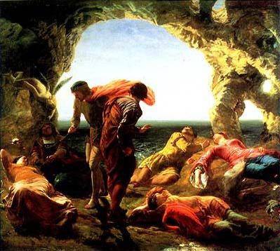 Gonzalo chides Sebastian and Antonio: "You are gentlemen of brave mettle; you would lift the moon out of her sphere, if she would continue in it five weeks without changing" (II.i.182-184) -- which sounds like a condemnation of the treachery of Howard and Arundel against Elizabeth (Ogburn and Ogburn 549). Everyone grows heavy with sleep except for the two carping rats, who tell Alonso they'll stand guard. Antonio and Sebastian decide that there's no way Ferdinand is "undrown'd" (II.i.237, 239), and that Alonso's daughter Claribel, who was recently married to the African king of Tunis, won't pose a problem with the kingdom being so far away. So, "what's past is prologue, what to come / In your and my discharge," says Antonio (II.i.253-254). He persuades Sebastian to murder his brother, he'll kill Gonzalo himself, and Sebastian can take over Naples just as Antonio has Milan. And everyone else will just fall into line: "For all the rest, / They'll take suggestion as a cat laps milk; / They'll tell the clock to any business that / We say befits the hour" (II.i.287-290). These two malcontents seem to forget that they're stranded on a desert island and that all this court plotting, sniping, and backstabbing is pointless and absurd.