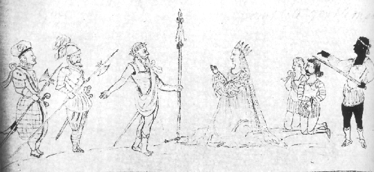 Saturninus, feeling mocked, no longer wants anything to do with the Andronicus family, calling Lavinia "that changing piece" (I.i.309) and selecting Tamora as his wife. Saturninus praises Tamora as "like the stately Phoebe" (I.i.316) -- the moon -- a comparison even Asimov thinks is odd (Asimov 400). Tamora vows to be a fine "handmaid" (I.i.331). Titus is not invited to the feast, and he rages about the dishonor done to the family who have been serving Rome and dying for "five hundred years" (I.i.350) -- a historically more logical reference to the Veres, actually (Ogburn and Ogburn 346). Titus must be coaxed into allowing Mutius' body into the family tomb, especially by Marcus, who notes: