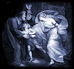 A Nurse arrives with "that which I would hide from heaven's eye, / Our Empress' shame, and stately Rome's disgrace! / She is delivered, lords, she is delivered" (IV.ii.59-61). Tamora's baby is obviously Aaron's too. Tamora has sent word that she wants the baby killed, though Aaron asks, "is black so base a hue?" (IV.ii.71). The sons of Tamora are angry: "Thou hast undone our mother" (IV.ii.75). "Villain, I have done thy mother," responds Aaron (IV.ii.76). Demetrius and Chiron, because of the dishonor, agree that the infant should be killed, but Aaron threatens to kill them if they harm their half-brother. He mocks their whiteness: "Ye white-lim'd walls! ye alehouse painted signs!" (IV.ii.98). Demetrius wails, "By this our mother is for ever sham'd" (IV.ii.112). Aaron's declaration, "He is your brother, lords" (IV.ii.126) "is not so much a plea for common humanity as a challenge to recognize in the self the evil that is too easily projected onto the Other" (Leggatt 249-250). After finding out how many witnesses there were at the delivery -- just the Nurse, a midwife, and Tamora -- Aaron kills the Nurse. He sends Tamora's sons to bury her and to find another mulatto baby he knows about light enough in skin to suffice for a switch to fool the Emperor: