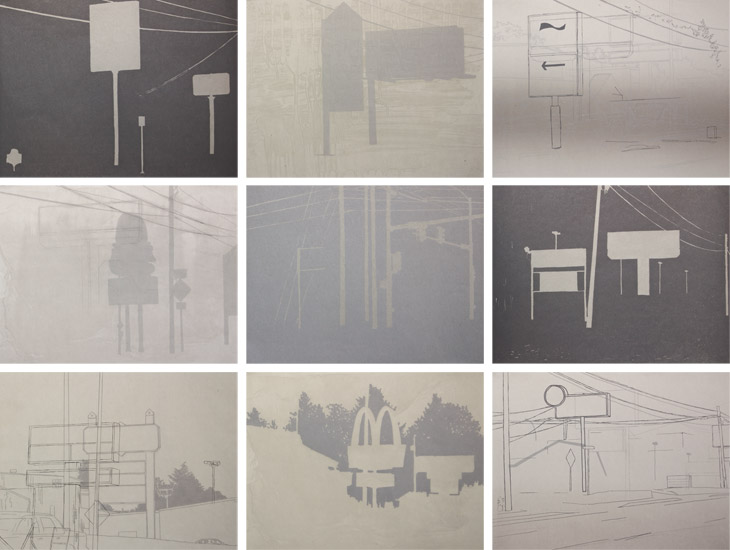The work of Kevin Haas depicts commercial landscapes found near the highways and interstates that surround and interconnect our cities. His prints address the ubiquity and displacement of these environments which fill an increasing part of our everyday landscape but often remain overlooked. He is compelled by his own tenuous complicity with these places and their seemingly infinite potential for sprawl. He focuses on the multiplicity of things that exist within built environment, and their seeming foreignness, and disconnection from our everyday lives.