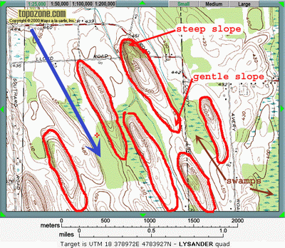 ![]() Drumlins - streamlined hill, asymmetrical in lengthwise profile with steep slope facing the direction from which the ice came |