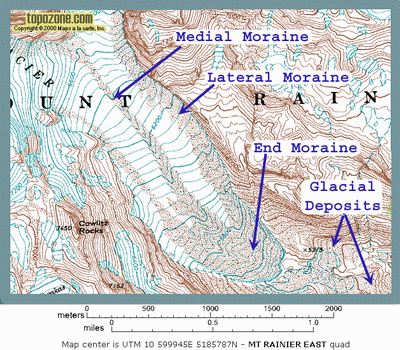 ![]() Lateral Moraine - Ridge of till formed from melting ice and mass wasting at the side of a valley glacier Medial Moraine - ridge of till either in transit or deposited along the boundary between two tributary glaicers that have merged to forma larger valley glacier |