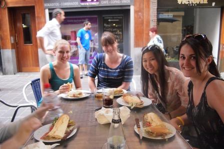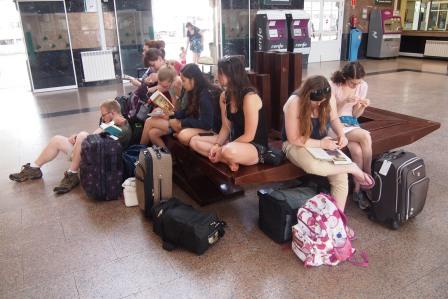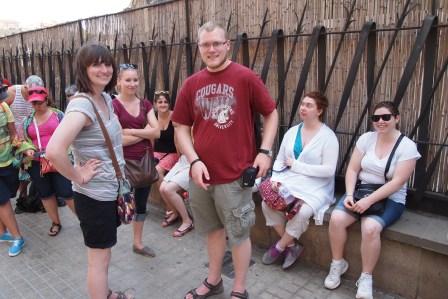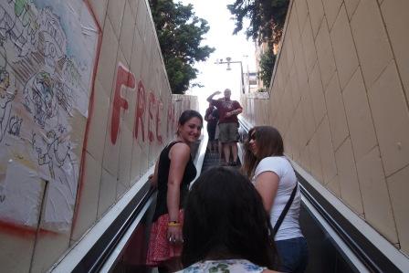 On the escalator towards Parc Guell, Barcelona - & waiting in line (1:20 hrs) outside Sagrada Familia: Julia, Kathryn, Bree, Beth (hidden), Payden, Carmen and Rose.