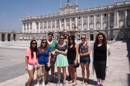 Kathryn and Julia blending in outside the Reina Sophia Art Museum, Madrid - El Palacio Real con grupo.