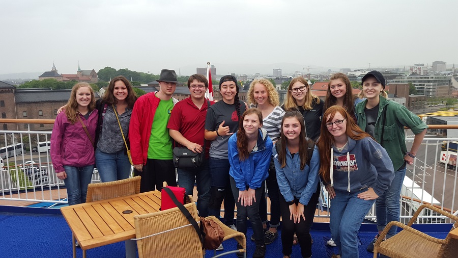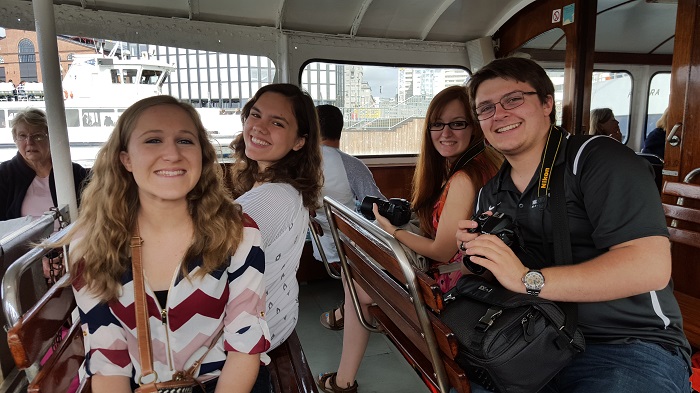Miranda, Olivia, Sabrina, and Karl on the ferry to the Oslo Viking ships.