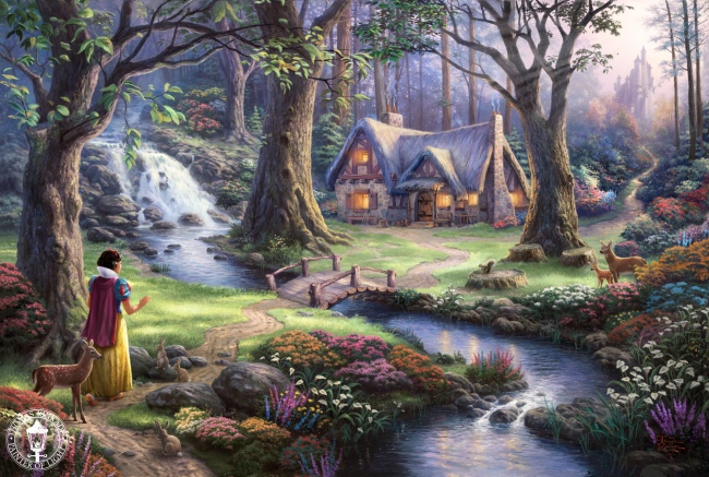 T. Kinkade: "Snow White Discovers the Cottage" 2008 (http://www.artofthesouth.com/Thomas_Kinkade/snowwhitediscoversthecottage.php)