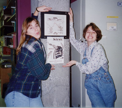 1995: Maria Meijer ('98) and Bonnie Baxter ('96) comparing Science cover, designating DNA Repair as the Molecule of the Year, to the Smerdon Lab logo. |