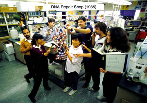 DNA Repair Shop 1985: (front row, L - R) Ahmed Murad, Brinda Ramanathan, Khalifah Sidik, Karen Jensen (back row, L - R) John Watkins, Jeff Lorenz, and Jim Gale. |